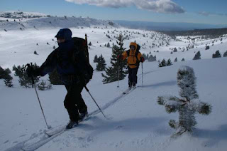 Temps molt variable i canviant, de serè a enbromat, de pluja a sol. Ens posem els esquis en creuar el pont (1750m). La solana està ja curta de neu. Neu dura tota la pujada, fem algun tram a peu. Baixem d’hora i la neu s’aguanta bé encara. Cal matinar!