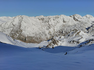 La sorpresa en forma de regal és quan deixem el nord i gaudim d’un descens tipus moqueta a la cara sud del coll. Boníssima baixada que allarguem més del compte fins els 2300m... el camí normal obliga a remuntar a partir dels 2400m... Nosaltres com que ha calgut posar pells més a baix ja portem inèrcia de pujada i enfilem fins el cim de la Tête Noire 2685m, fantàstic! i millor baixada, altra cop a sud.